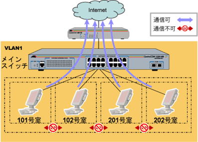 | マルチプルVLANによりポート間(居住者間)の通信を遮断することで、インターネットサービスだけを安全に提供することが可能になります。不特定多数へインターネット環境を提供する際に最適な機能です。